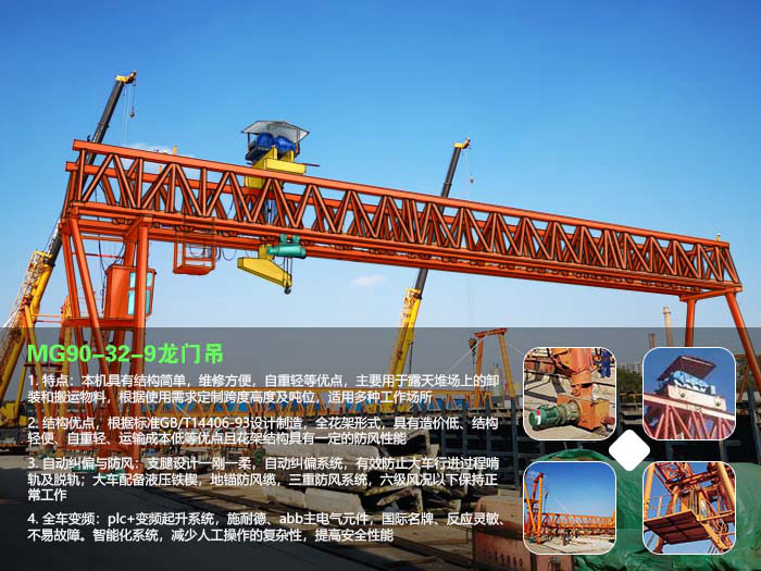 它由門架、大車走行機構、起升機構、吊具、爬梯欄桿、電氣系統及安全裝置等幾大部分組成。