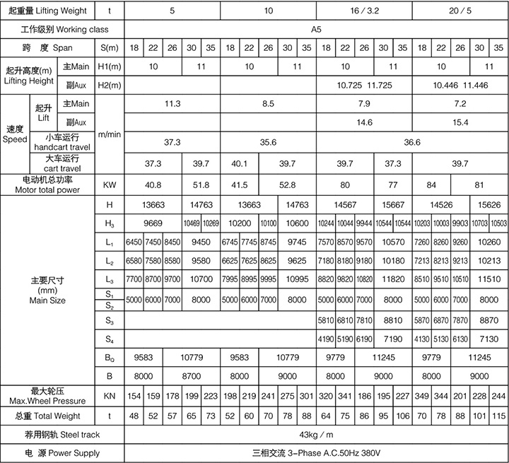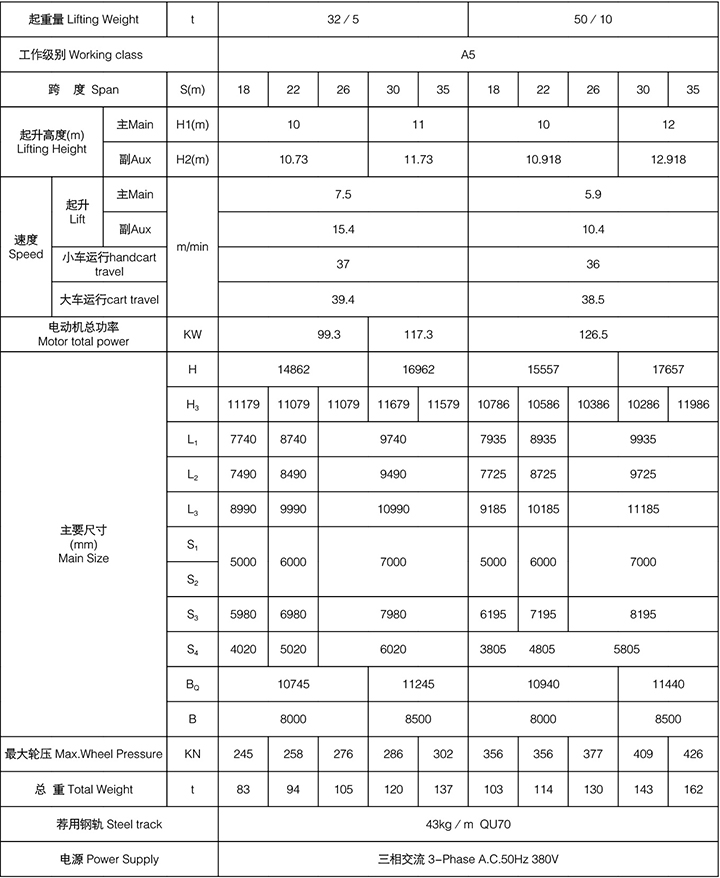 本起重機(jī)由橋梁、大車運(yùn)行機(jī)構(gòu)、小車、電氣設(shè)備組成。橋架采用箱形焊接結(jié)構(gòu),大車運(yùn)行機(jī)構(gòu)采用分別驅(qū)動。全部機(jī)構(gòu)均在操縱室內(nèi)操縱。起重機(jī)導(dǎo)電形式分為電纜和滑觸線兩種,訂貨時任選一種。選用本起重機(jī)時須填寫訂貨規(guī)范表,須注明使用時工作環(huán)境的最低溫度和最高溫度以及電源等。