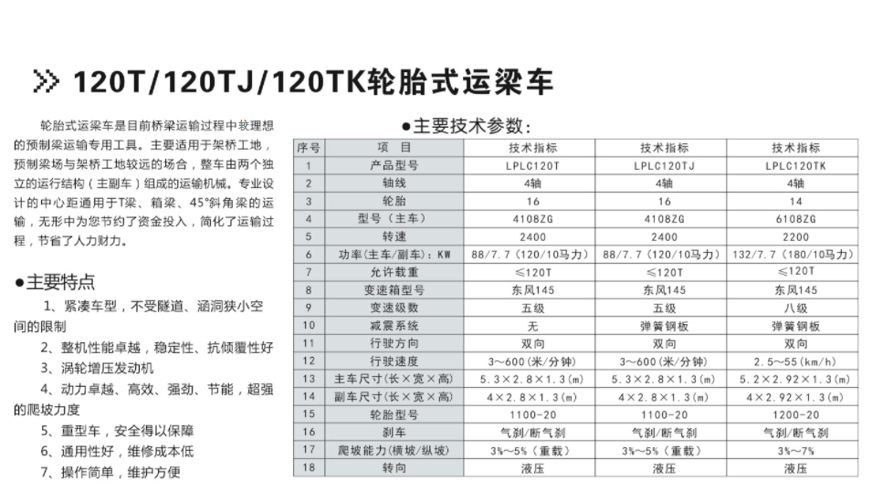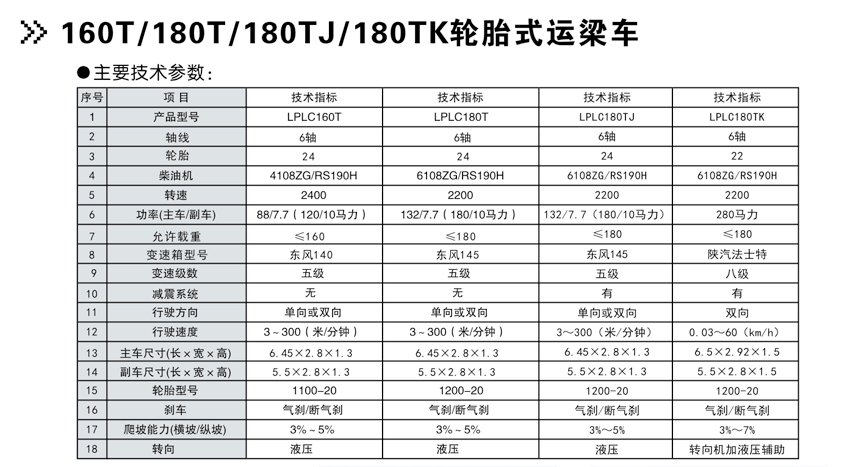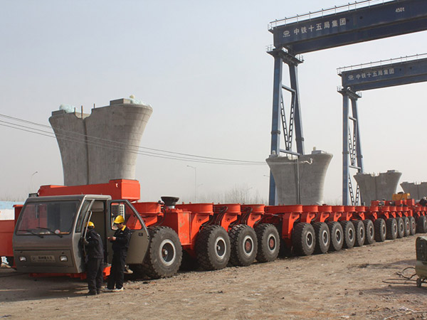 運梁車,將在預制廠或橋梁現場預制的鋼筋混凝土梁橋橋面板運送到架橋機的專用車輛。分軌行式和輪胎式等。主要由幾十個驅動輪與從動輪、車架、駕駛室、操縱控制系統、輔助裝置等組成。由于載重大(達千噸),故要求高度低,以降低架橋機總體高度。是架橋機施工的配套設備。